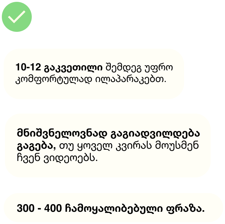 - ყოველი გაკვეთილის შემდეგ დაემატება ფრაზები, რომლებსაც შეძლებ ივარჯიშო შენს ტელეფონზე, ასევე გრამატიკის განმარტებები.